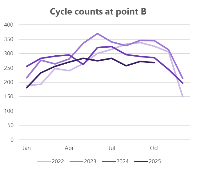 At point B, over on the Leeds side, the number of cyclists is higher, but follows a similar downward trend. This may have been in part because of work being done on the roads around there, but still suggests bike-riding is in a slight slump.