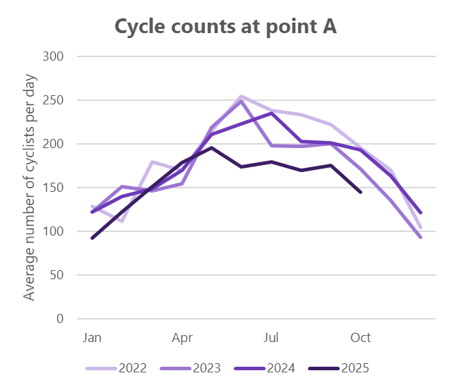 The dataset I’m interested in, optimistically titled “Leeds Annual Cycle Growth,” provides monthly updates for 26 cycle counters on the network, making it possible to track how busy the CS1 really is. Point A on the map above, just outside Bradford, typically sees 100-250 cyclists go past a day (counting both directions), depending on the time of year. That’s not nothing, but still pales in comparison to the number of cars barrelling past. More dishearteningly, the number of cyclists dipped in 2025. If cycling was taking off, you’d expect to see the opposite.